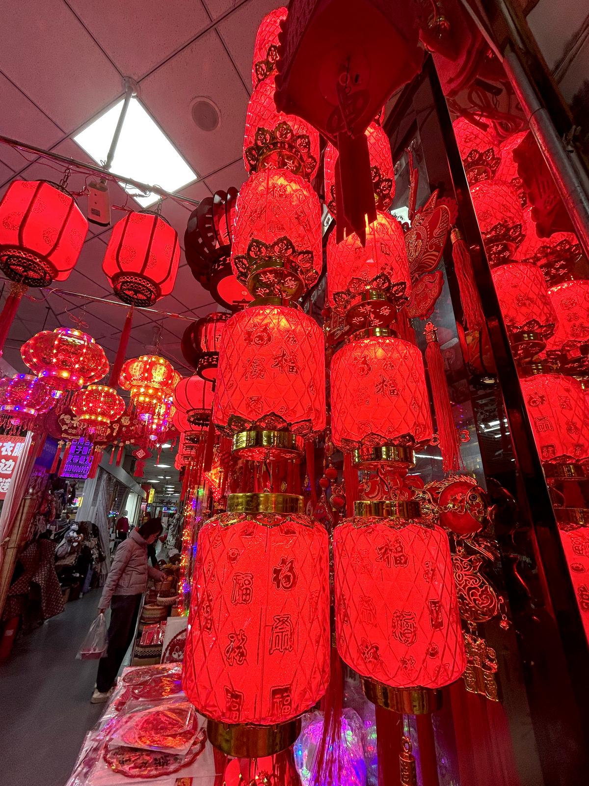 走进市场,目之所及皆是红火景致。红彤彤的灯笼挂满街巷,金粉勾勒的 “福” 字、春联层层叠叠,流光溢彩的彩灯串起一路欢喜。市民们穿梭在摊位间,细细挑选心仪的年货,手里提着的红灯笼、怀里抱着的吉祥挂饰,将喜悦写在脸上。
