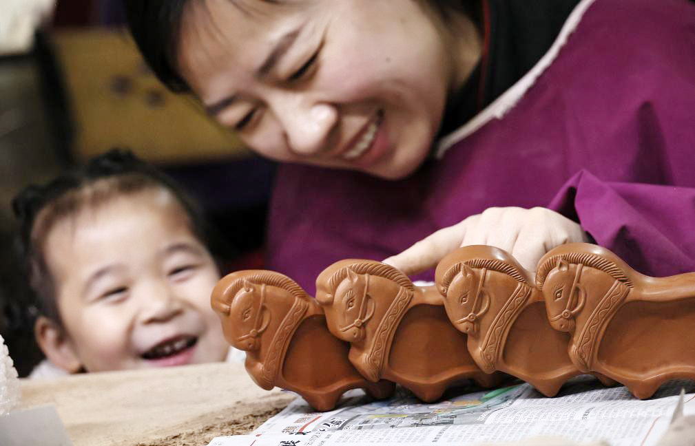 2月10日,在运城市新绛县中国绛州澄泥砚文化园生产基地,制砚工艺师给小朋友介绍马年生肖砚。高新生 摄