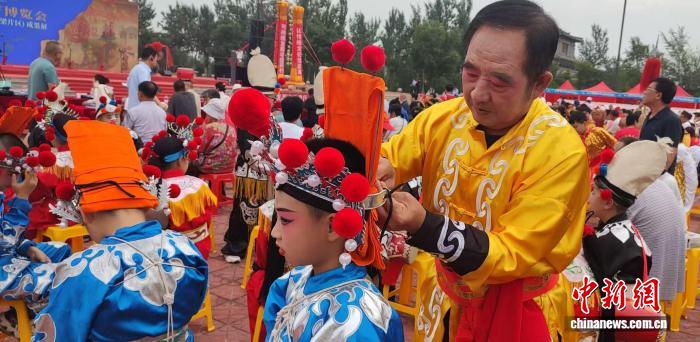 李长喜为参加汾阳地秧歌表演的孩子整理装束。李长喜 供图