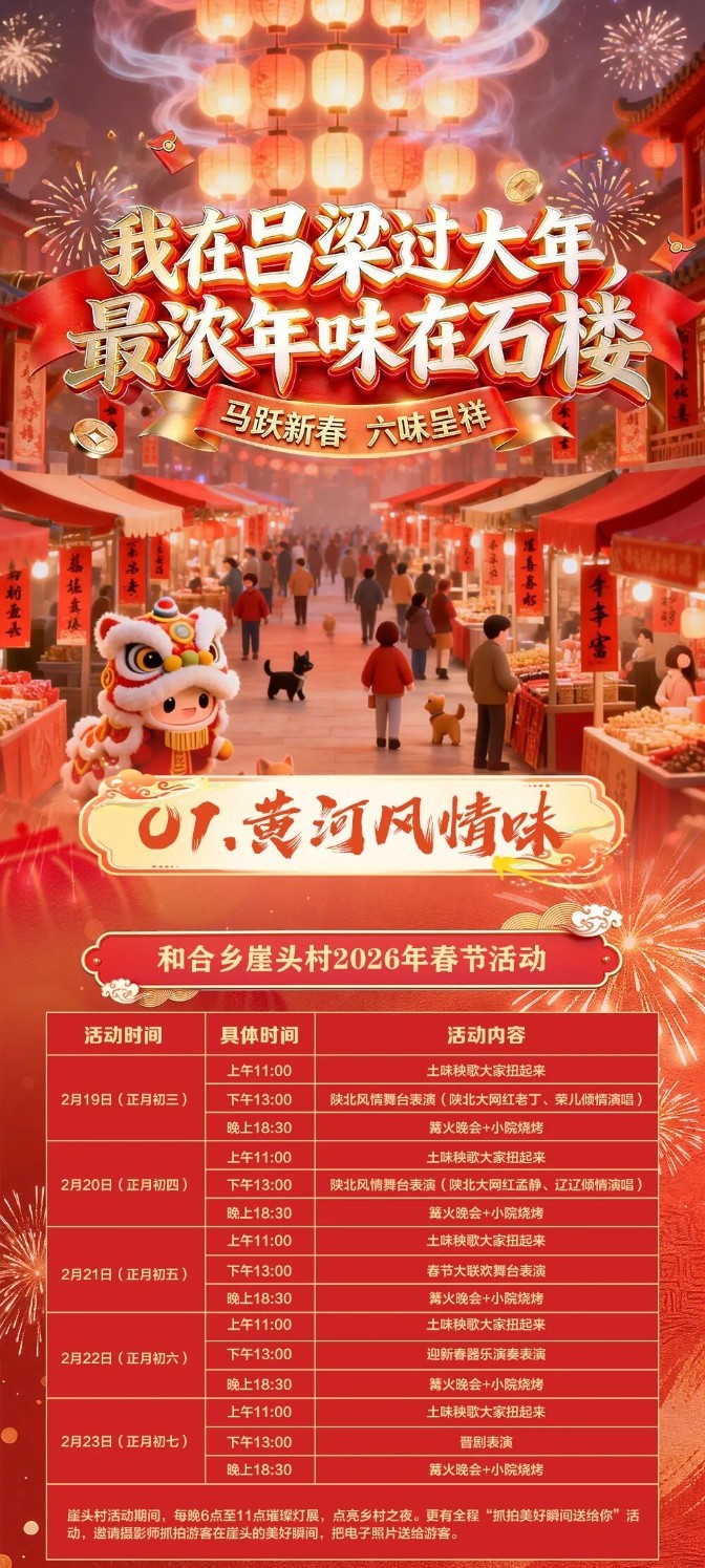 2026年农历新春的脚步渐近,山西省吕梁市石楼县已悄然披上节日的盛装。今年,石楼以“我在吕梁过大年,最浓年味在石楼”为主题,精心推出“马跃新春·六味呈祥”系列春节活动,融合黄河风情、民俗传承、乡韵活力、烟火暖情、星火红韵、翰墨书香六大风味以及全域新春盛事,一系列精彩活动将陆续登场,并联动城乡、辐射全域,打造一场覆盖全县、贯穿正月的新春文化盛宴。