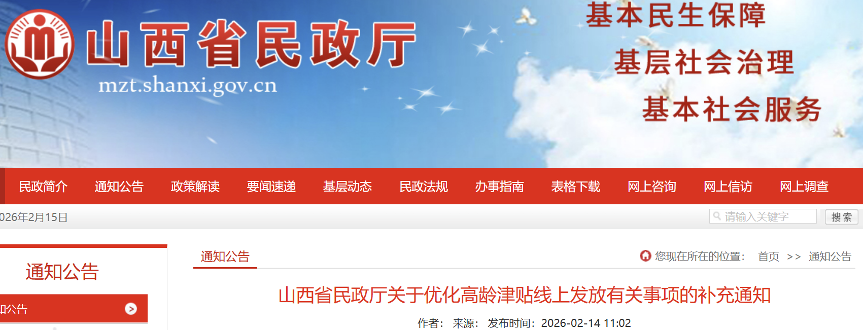 近日,山西省民政厅发布《关于优化高龄津贴线上发放有关事项的补充通知》,进一步规范完善高龄津贴发放与管理工作,构建精准、便捷、安全的发放管理体系,切实提升高龄老年人获得感与基层履职效能,该通知自发布之日起施行。