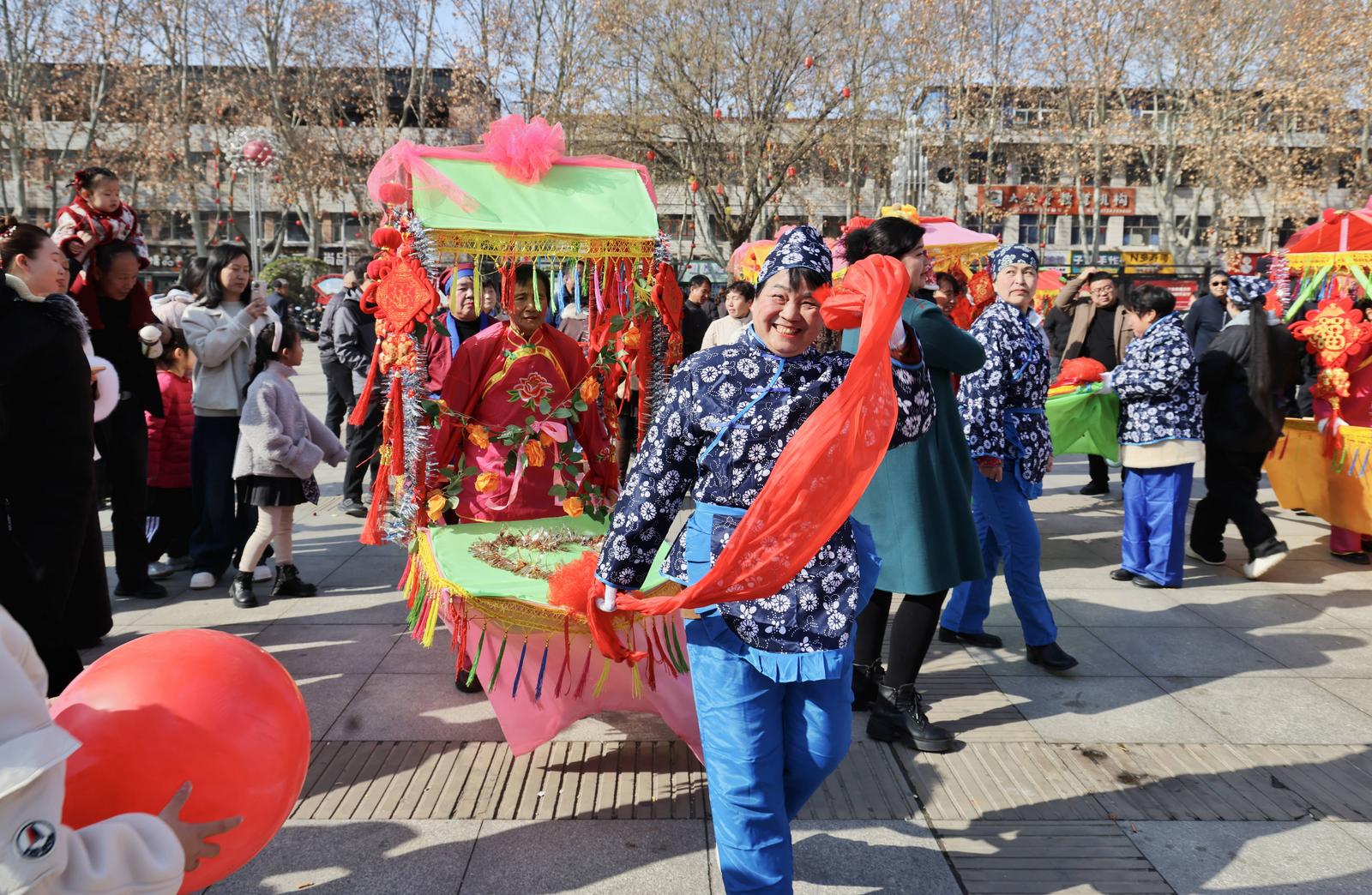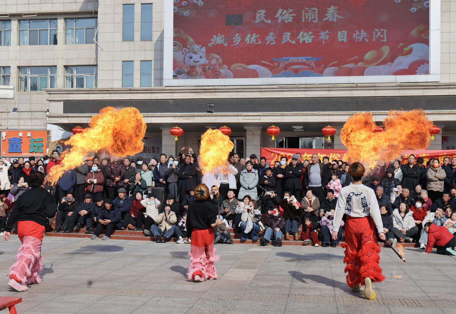 2月18日,运城市绛县电影院广场,南樊镇民俗表演队在表演舞狮等民俗节目。群众欢聚一堂,喜迎新春。