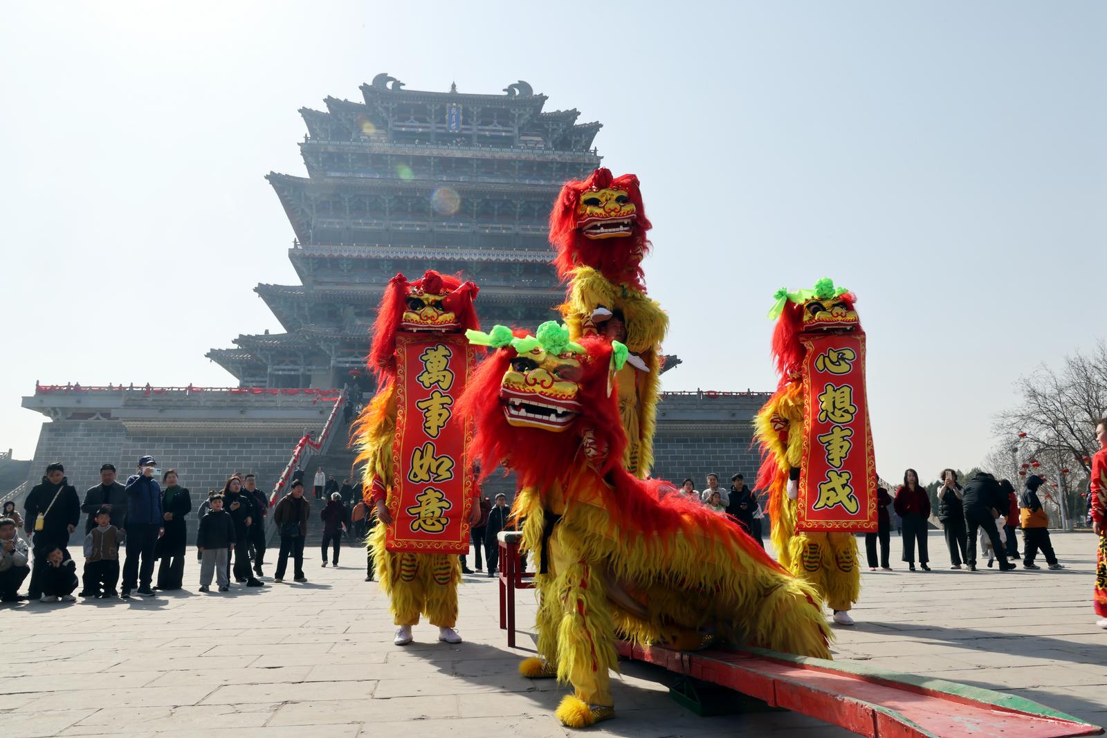 2月19日,永济鹳雀楼张灯结彩,喜气洋洋。景区精心打造的非遗舞狮、龙腾盛世主题展演火热上演。陈春明 摄