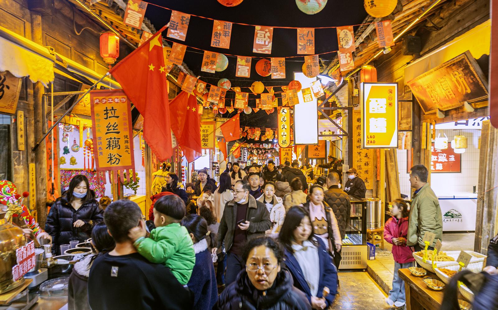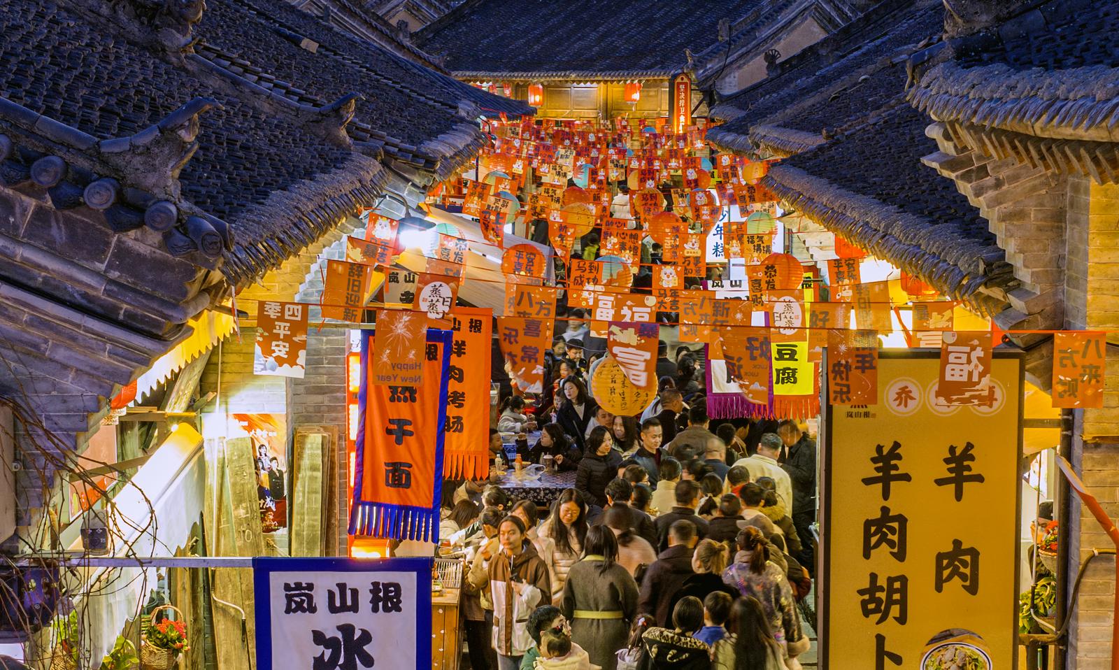 2月19日,运城岚山根·运城印象景区张灯结彩,人头攒动。璀璨的灯火点亮古街夜色,浓郁的年俗氛围吸引着各地游客与市民齐聚于此。赏夜景、品美食、逛市集,在浓浓的烟火气中感受运城别样的春节魅力。