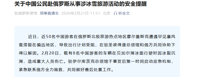 近日,近50名中国游客在俄罗斯北极旅游热点地区摩尔曼斯克遭遇罕见暴风雪滞留在偏远地区,导致出行计划受阻,在驻圣彼得堡总领馆和俄方共同协助下得以解困。2月20日,载有8名中国游客的车辆在贝加尔湖冰面行驶时因冰裂沉湖,造成重大人员伤亡。驻伊尔库茨克总领馆于事发后第一时间启动应急机制,紧急联系俄方全力施救,共同做好善后处置工作。