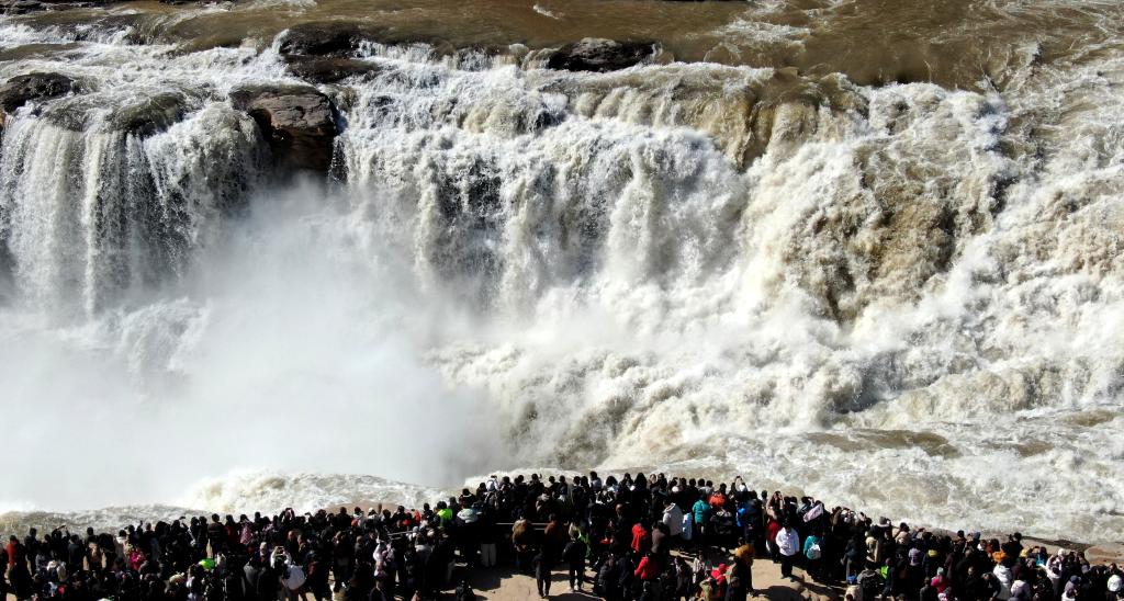 据当地水文部门介绍,随着气温回升,目前黄河壶口瀑布段已完全开河,由于冰雪消融等因素影响,黄河壶口瀑布最大水流量超过750立方米/秒,约为日常水流量的2倍,再现壮美瀑布群景观。
