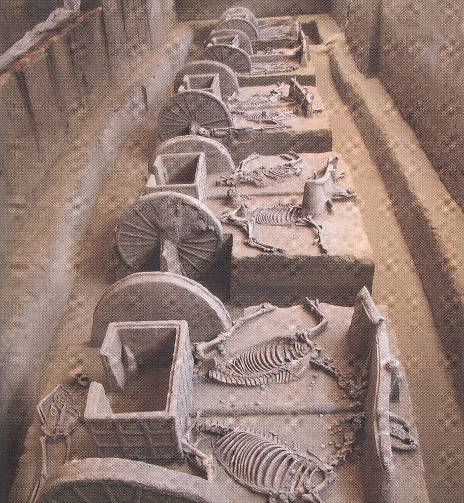 △殷墟,商代晚期都城遗址。殷墟安阳钢铁厂出土商代晚期车马坑。
