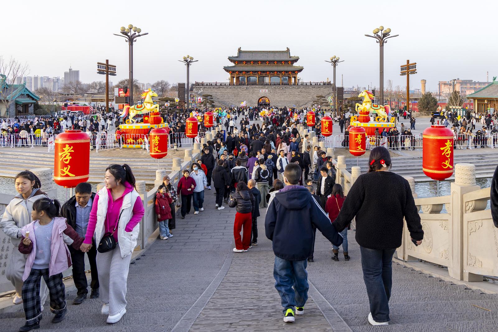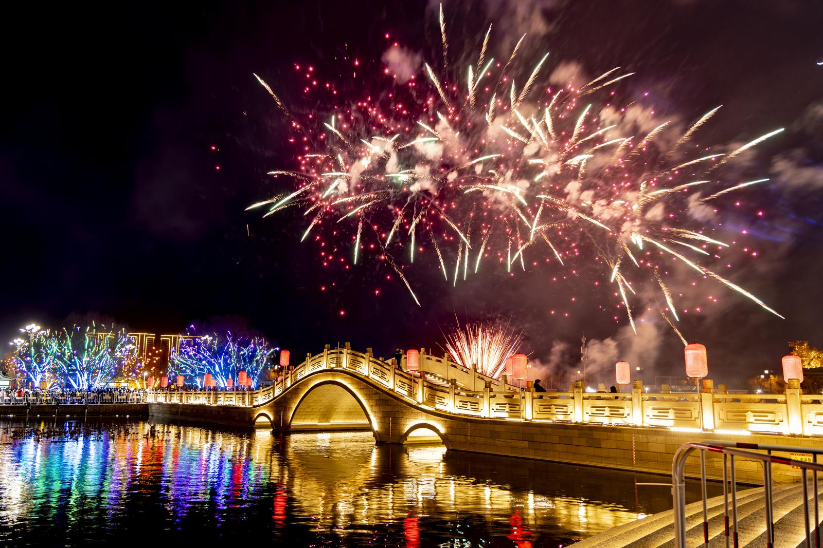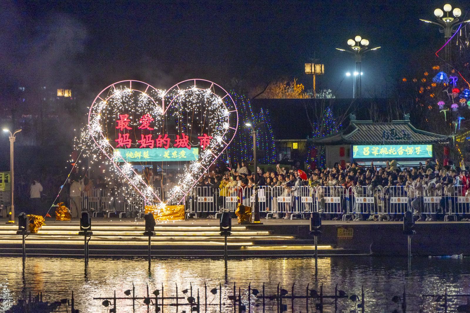 春节期间,吕梁孝义老城游人如织,游客们体验花船游湖,看城墙灯光秀。打铁花、焰火在南化湖展现,老城的火树银花不夜天,让游客们体会到了红红火火的中国年。