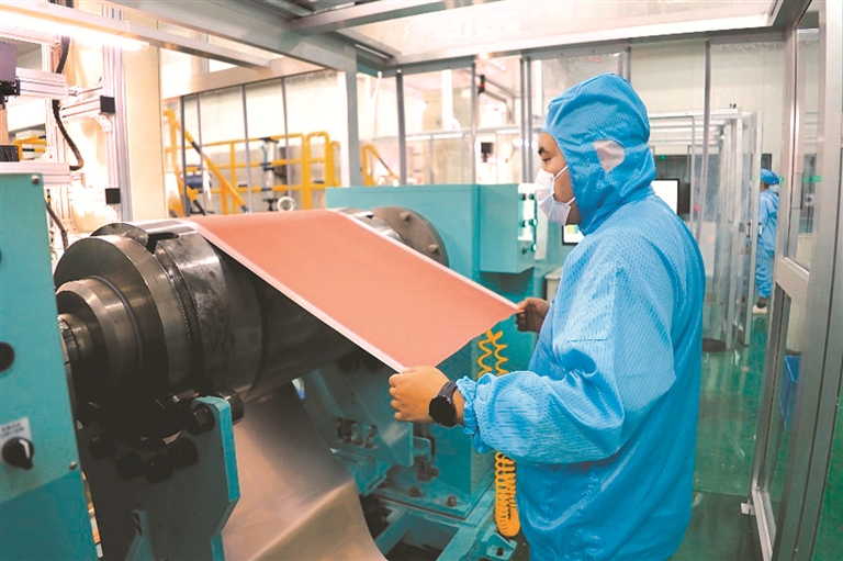 铜箔事业部经理助理杨景召穿梭在生产线之间,不时与工人交流几句。他告诉记者,从今年年初开始,生产线就未停歇。“客户等着我们的产品,尤其是新能源电池和5G基站领域,铜箔是重要材料,我们必须确保按时交付。”