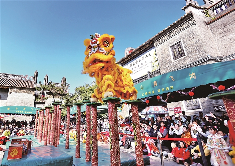 醒狮队在广东省佛山市祖庙景区进行梅花桩表演。新华社发