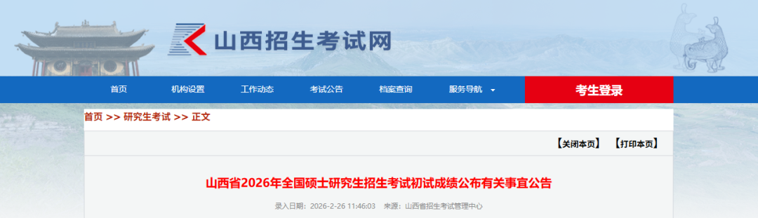 按照教育部有关安排,山西省2026年全国硕士研究生招生考试初试成绩将于2026年2月28日起公布,现将有关事宜公告如下: