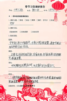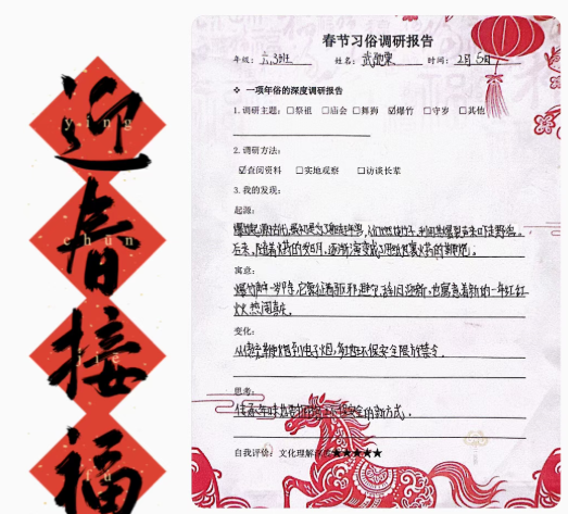 本次寒假特色新春民俗实践活动聚焦春节文化核心内涵,明确要求学生围绕春节庙会、乡村赶集、特色美食、传统民俗活动等内容开展调研。活动启动后,松侨小学五、六年级的同学们积极行动起来,开启了一场别开生面的民俗探寻之旅。在调研过程中,同学们充分发挥主观能动性,有的走进图书馆、翻阅民俗典籍,系统梳理春节习俗的历史渊源与文化寓意;有的跟随家人走进热闹的庙会、熙攘的集市,实地观察舞龙舞狮、剪窗花、写春联、逛年货摊等民俗场景,用眼睛捕捉年味,用脚步丈量文化;还有的围坐在长辈身边,认真聆听爷爷奶奶、外公外婆讲述儿时过年的故事,访谈春节祭祖、守岁、拜年、吃年夜饭等传统习俗的讲究与传承,在一问一答间感受亲情与文化的交融。
