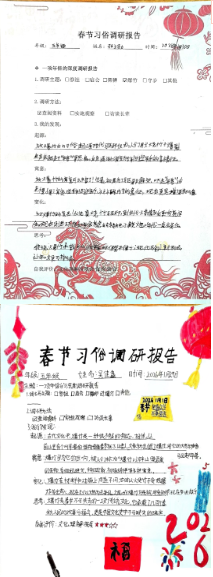 从贴春联、挂灯笼的喜庆仪式,到蒸花馍、包饺子、吃年夜饭的舌尖年味;从庙会里的民俗表演、非遗展示,到乡村集市的年货琳琅、烟火气息;从走亲访友的拜年礼仪,到守岁祈福的传统习俗,同学们的调研内容丰富多元、贴近生活。大家将调研中收集到的文字资料、拍摄的实景照片、手绘的民俗插画、记录的访谈心得,精心整理、排版设计,以A4纸竖版呈现,制作出一份份兼具知识性、趣味性与艺术性的春节习俗小调研报告。每一份报告都凝聚着同学们的探究心血,有的详细梳理了太原本地春节特色美食的制作方法与文化寓意,有的图文并茂展现庙会与赶集的热闹场景,有的系统记录了不同年龄段长辈眼中的春节变迁,字里行间满是对传统文化的好奇与热爱。