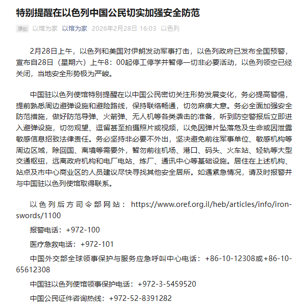 2月28日上午,以色列和美国对伊朗发动军事打击,以色列政府已发布全国预警,宣布自28日(星期六)上午8:00起停工停学并暂停一切非必要活动,以色列领空已经关闭,当地安全形势极为严峻。