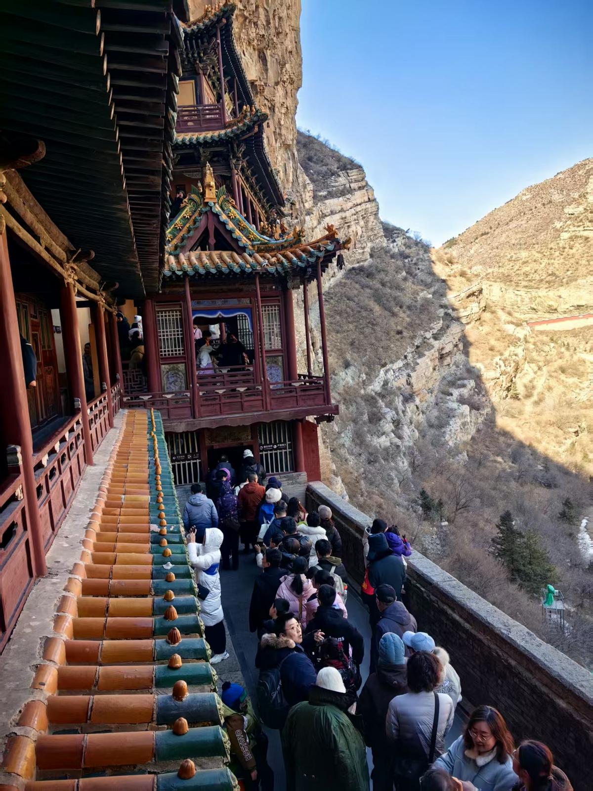 在悬空寺登临处等待区,精心准备的开水不时冒着热气。很多旅客来领取军大衣穿上,接一杯热水喝上,排队等待的时间不觉得长了,人也不觉得冷了。一位学生的摄影器材不小心掉到附近内湖的冰面上,保洁的同志主动想办法,用绳子拖拽,用扫帚划拉,帮助捡回来。