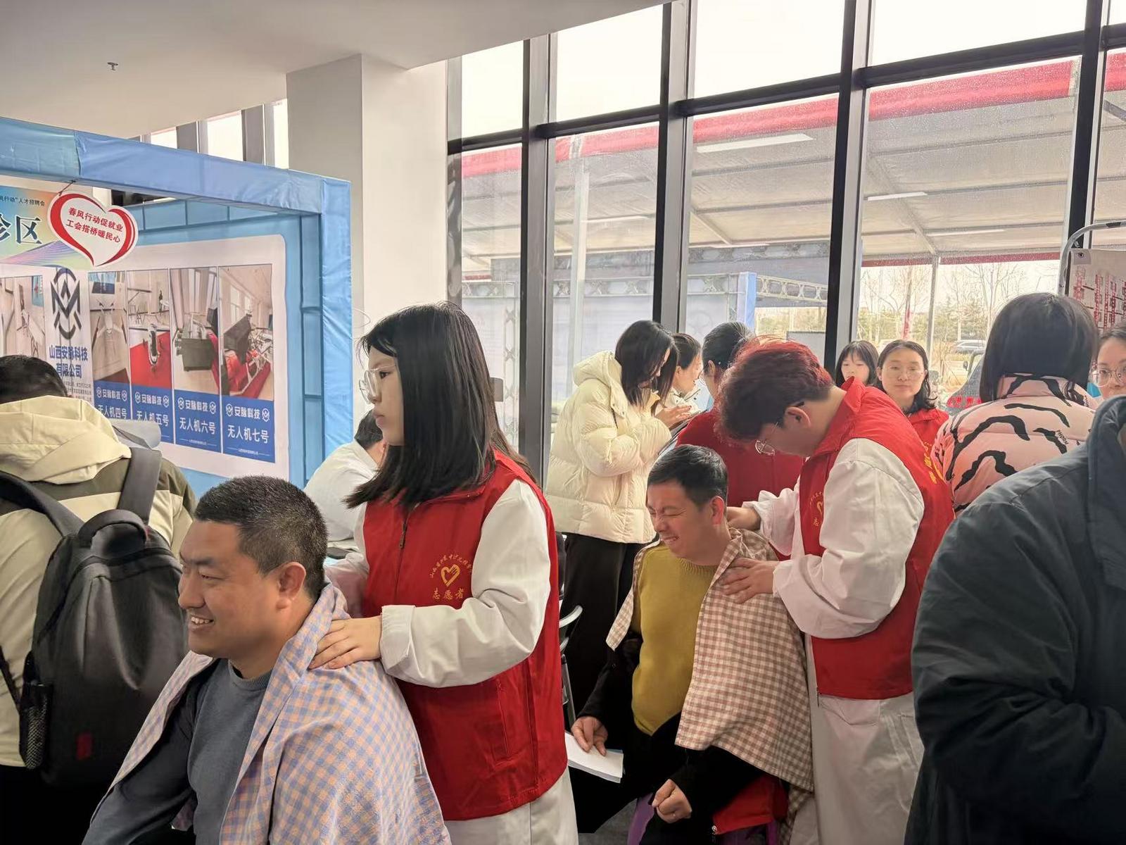 志愿者为求职者提供肩颈按摩等暖心服务