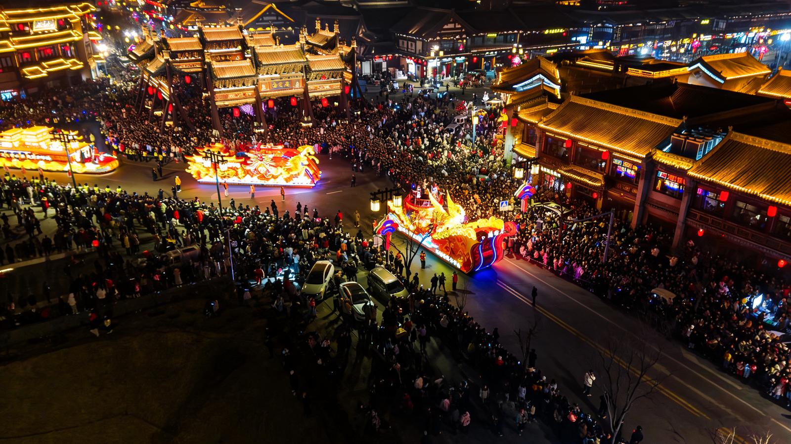3月1日,大同古城景区元宵花车穿行古街,现场人头攒动。 石潇宇 摄