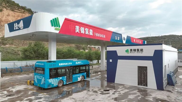 吕梁氢燃料电池公交车正在加氢站加氢。