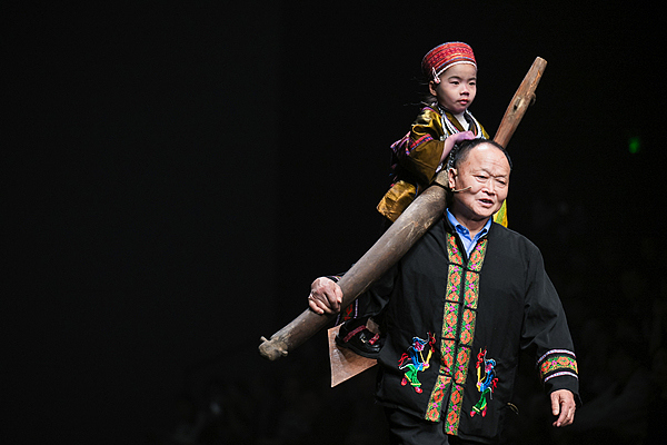 苗族爷爷扛着孙女走向T台,展现苗族农耕文化元素。黔东南州委宣传部提供