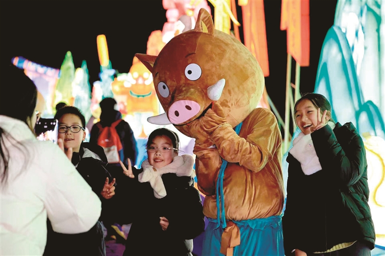 大同古城永泰门,非遗与科技深度互嵌。长50米、高22米的巨型主灯《天马鼓舞·盛世呈祥》前,游客们击响小鼓,大鼓随着光影律动——四川自贡的传统灯彩技艺,在这里幻化出北魏战马奔腾的雄姿。灯会里,魏碑书法、北魏蓝釉、云冈造像,与浪浪山小妖怪、花木兰等潮流IP同台竞技。“我们希望多花点心思,让文化充满活力,让游客感受到满满的年味儿。”灯会工程总负责人米梦林说,截至目前,古城灯会客流量约40万人次。