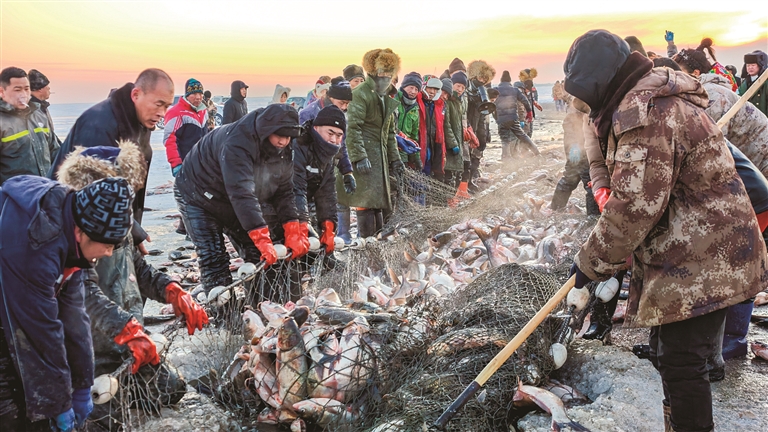 镩冰凿洞、穿杆走网、马拉绞盘、收网腾鱼,当渔网缓缓拉出,数万斤鲜鱼簇拥破冰,争相翻腾……每年12月上旬到次年2月中旬,这样的冬捕盛景总会在吉林查干湖上演。“冰湖腾鱼”的丰收景象,不仅让现场游客振奋不已,也通过网络传递到千家万户。