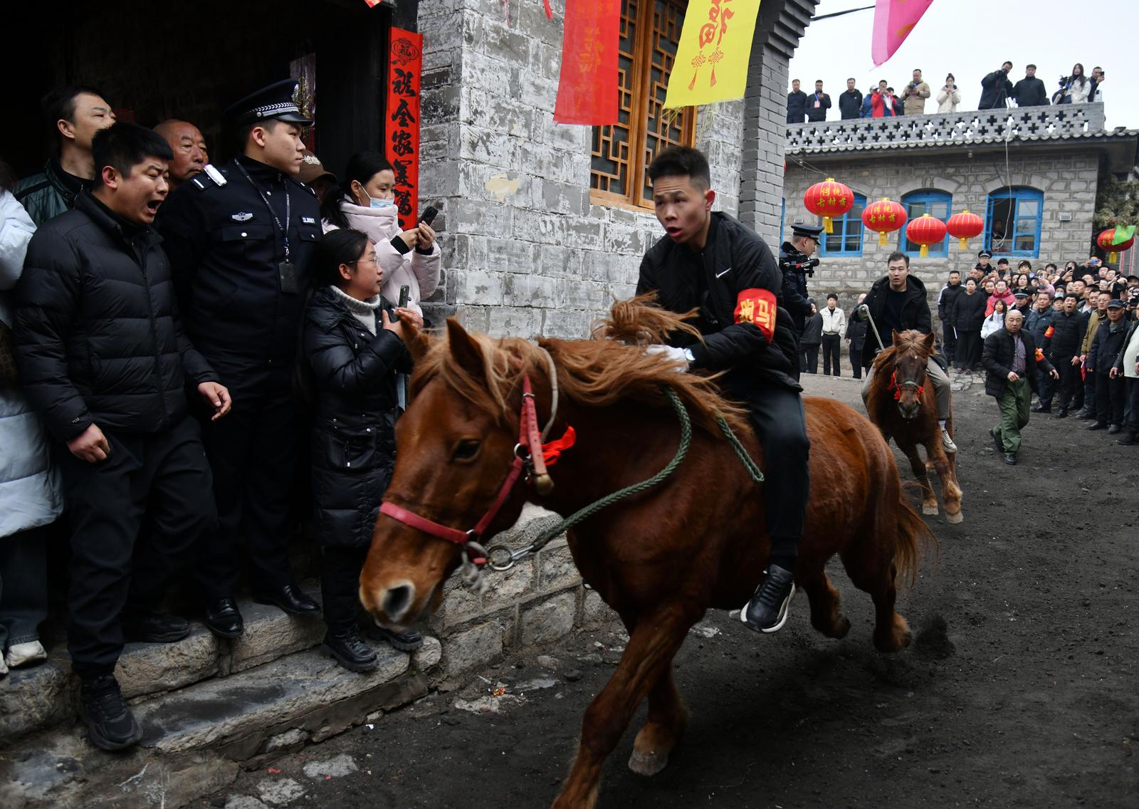 3月4日,阳泉市平定县娘子关镇下董寨村一大早开始沸腾起来了,一年一度的跑马排活动在这里举行。来自各地的游客如约而至,感受跑马排的魅力。活动现场,伴随“咣咣咣”急促的开道锣声,几名骑手执缰策马从古街疾驰而过。马上无鞍无镫,仅靠双腿夹紧马腹稳定身体,在只有4米左右宽的街道上来回穿梭。鼓声、马蹄声、呐喊声此起彼伏,让观众看得惊险刺激,给人留下深刻的印象。下董寨村已有近2000年的历史,是中国传统村落、中国历史文化名村。“娘子关跑马排春节习俗”现也成为国家级非物质文化遗产代表性项目。