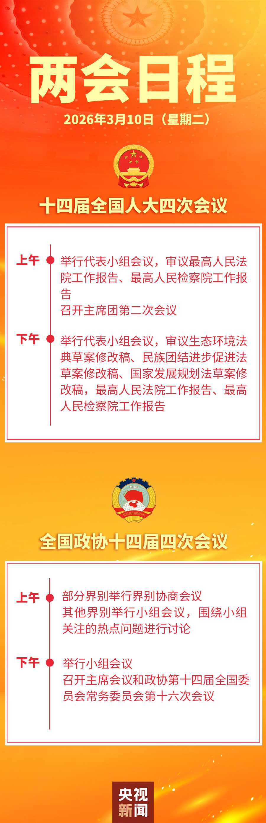 两会日程预告丨3月10日:人代会审议“两高”工作报告等 政协举行界别协商会议和小组会议