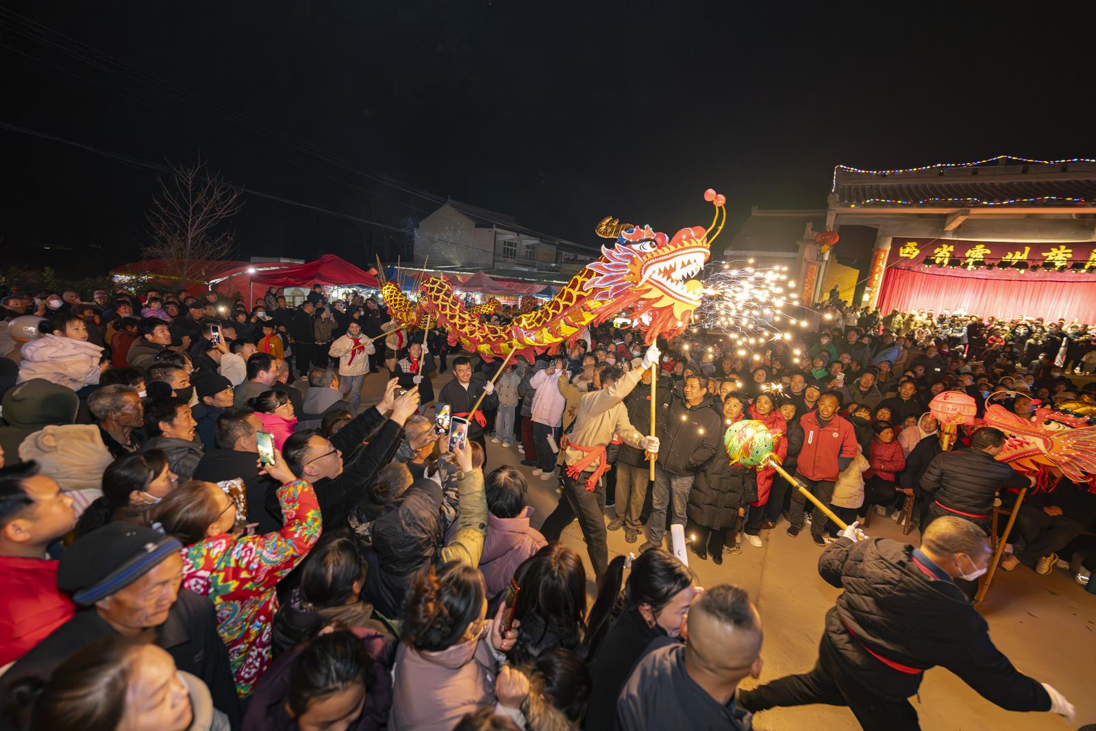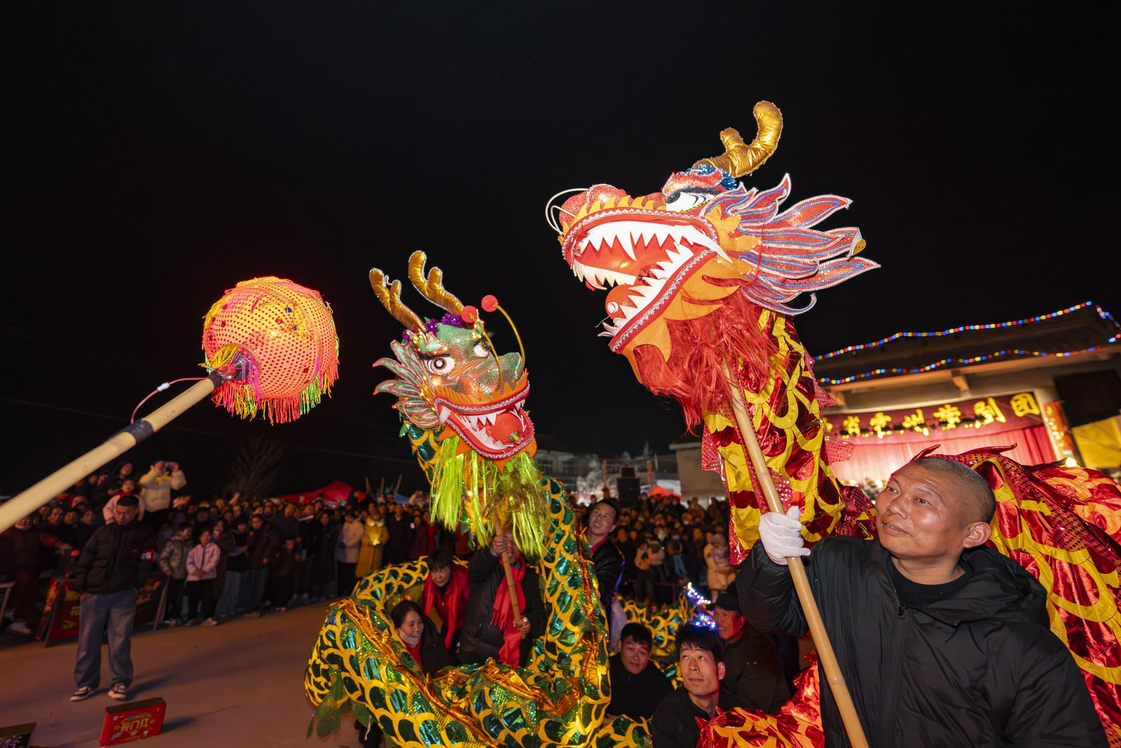 活动现场,震天的锣鼓敲响了丰收的喜悦与生活的热望。村民们自发组织的舞龙队伍穿梭巡游,时而盘旋,时而腾起,气势非凡;威风凛凛的“雄狮”腾挪跳跃,活灵活现,赢得围观群众阵阵喝彩。夜幕降临,绚烂的焰火次第绽放,如繁花点亮乡村夜空,映照出一张张欢欣的笑脸。