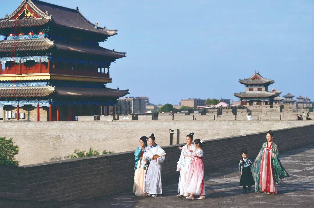 游客身着汉服在忻州古城城墙上游玩。摄影冯晓磊