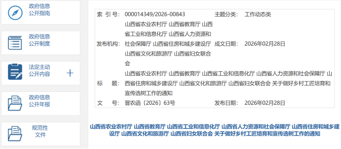 近日,山西省农业农村厅、山西省教育厅等七部门联合印发通知,要求进一步规范山西省乡村工匠培育和宣传选树工作,助力巩固拓展脱贫攻坚成果、推进乡村全面振兴。