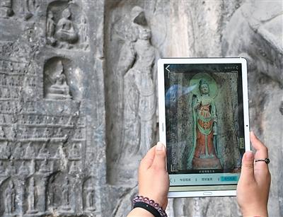 从2005年起,龙门石窟研究院开始为龙门石窟建立数字化档案,借助激光扫描等技术手段收集文物数据,以数字的形式留存千年石刻群的风貌。图为龙门石窟研究院工作人员在万佛洞前查看数字化复原后的造像。(新华社记者 李嘉南摄)