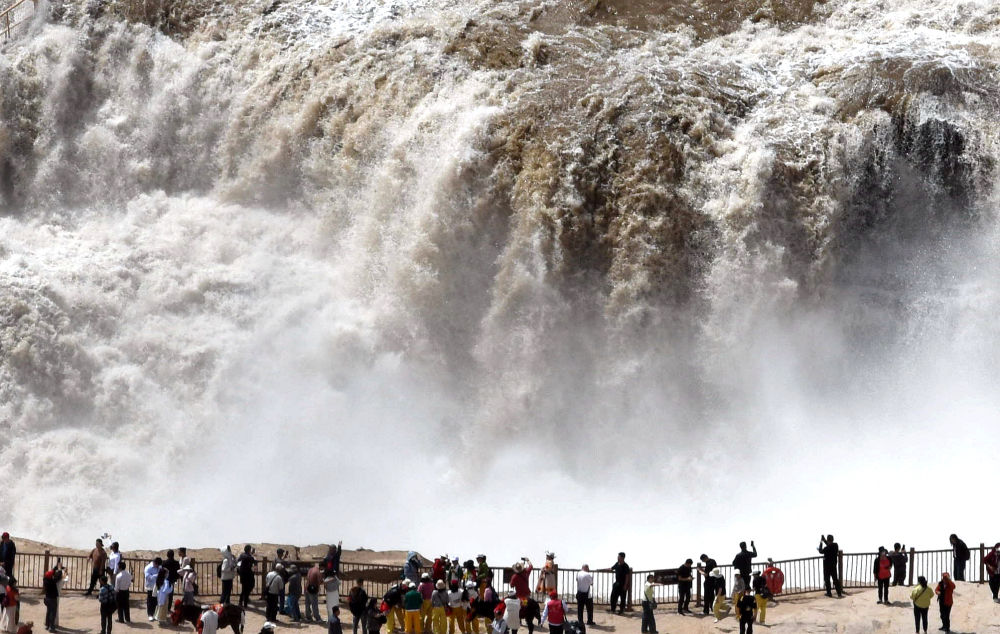 游客在欣赏壶口瀑布“桃花汛”。