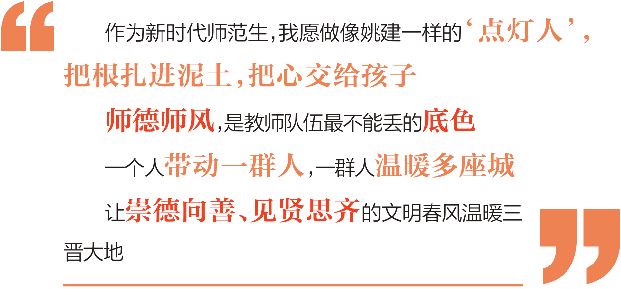 从雁北到河东,从太行到吕梁,还有许多像姚建一般以坚守诠释师者担当的身影。多年坚持手写训练计划,事无巨细照料学生生活的忻州实验中学体育教师齐富德曾说要“站到站不动那天”。“从姚建到齐富德,他们身上共同闪耀着师者仁心的光芒。”忻州市教育局人事科科长张勇说,全市教育系统将以姚建、齐富德为榜样,努力锻造一支师德高尚、业务精湛、充满活力的高素质师资队伍,为建设教育强市提供坚实支撑。