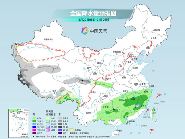 明天,新疆南疆西部山区、西藏北部和西部、青海南部、川西高原北部等地部分地区有小到中雪或雨夹雪,其中,西藏西部、新疆南疆西部山区等地部分地区有大到暴雪,局地大暴雪;西藏东南部、甘肃南部、陕西南部、贵州中东部、云南东南部、江南、华南北部、福建中北部、台湾岛东部等地部分地区有小到中雨,其中,广西东北部、福建西部等地部分地区有大雨。