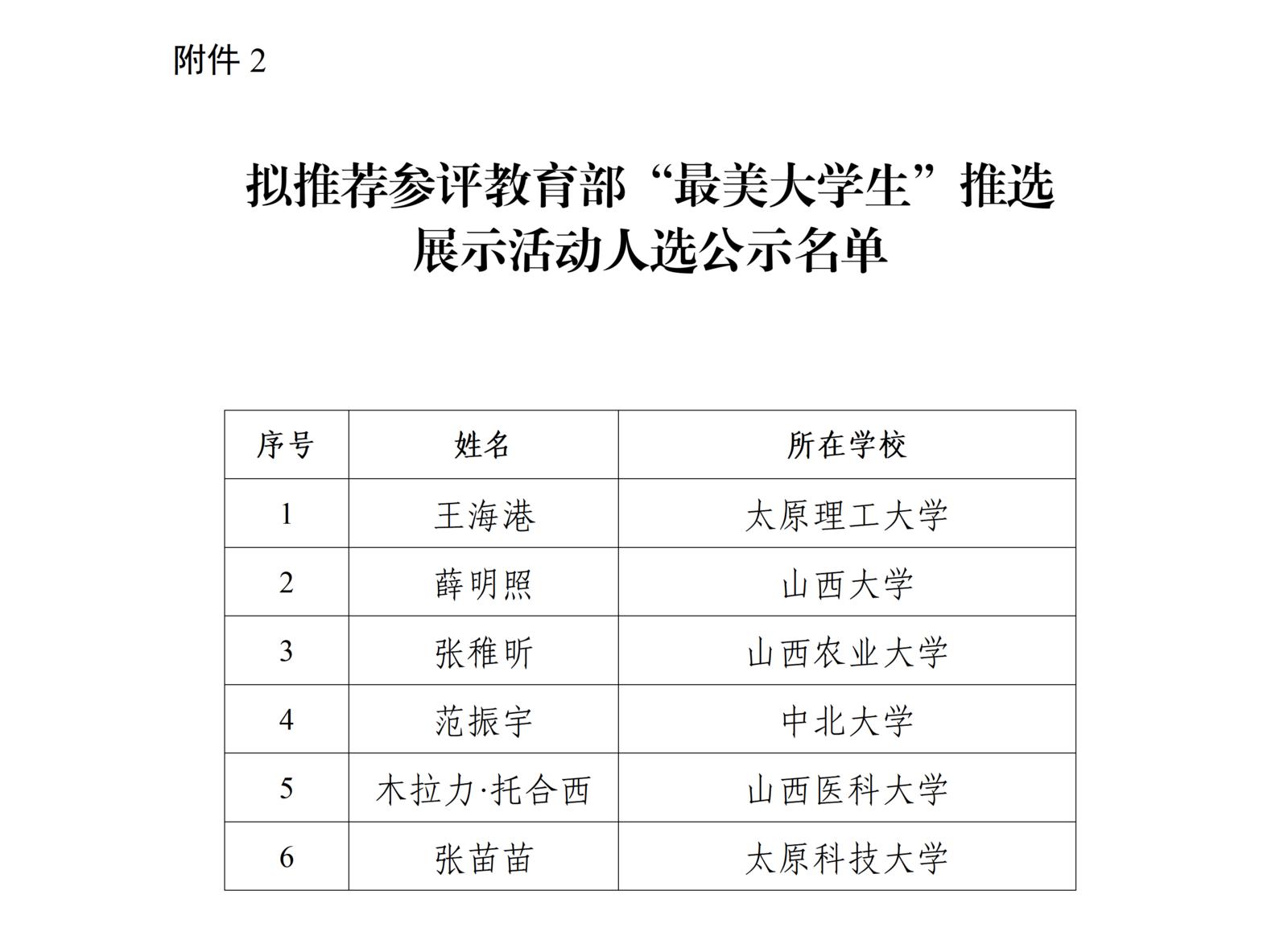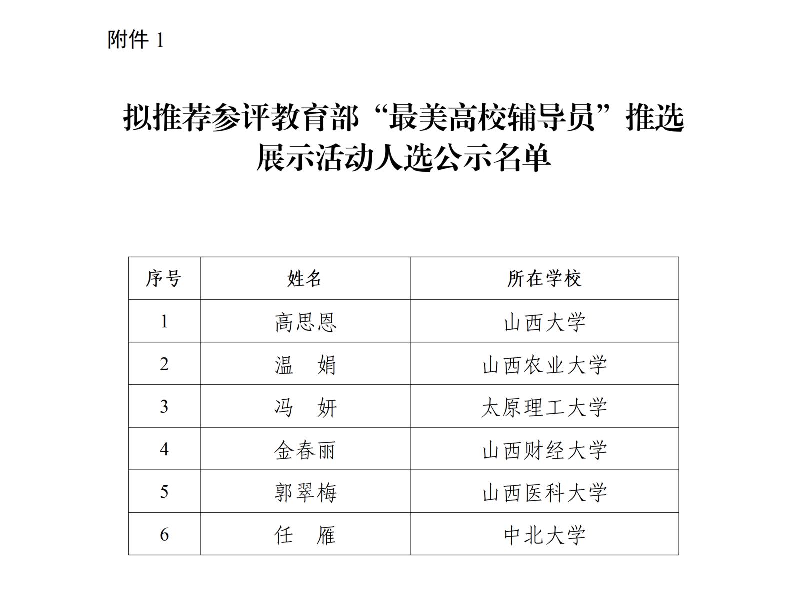 根据《教育部办公厅关于开展“最美高校辅导员”“最美大学生”推选展示活动的通知》和《山西省教育厅关于开展“最美高校辅导员”“最美大学生”推选展示活动的通知》要求,经各高校推荐、资格审核、专家评审,拟推荐山西大学高思恩等6名辅导员参评教育部“最美高校辅导员”推选展示活动(名单见附件1),拟推荐太原理工大学王海港等6名大学生参评教育部“最美大学生”推选展示活动(名单见附件2)。现将推荐名单予以公示。