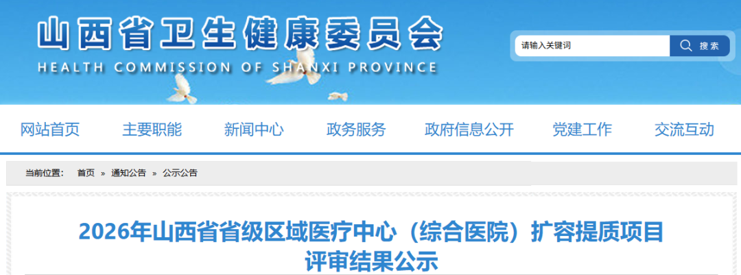 按照山西省卫生健康委员会、山西省财政厅《关于组织申报2026年山西省医疗卫生强基工程项目的通知》(晋卫规划函〔2026〕8号)要求,省卫生健康委、省财政厅组织专家对各申报市开展了竞争性评审。根据竞争性评审结果,拟确定忻州市、阳泉市、朔州市为省级区域医疗中心(综合医院)扩容提质项目市。