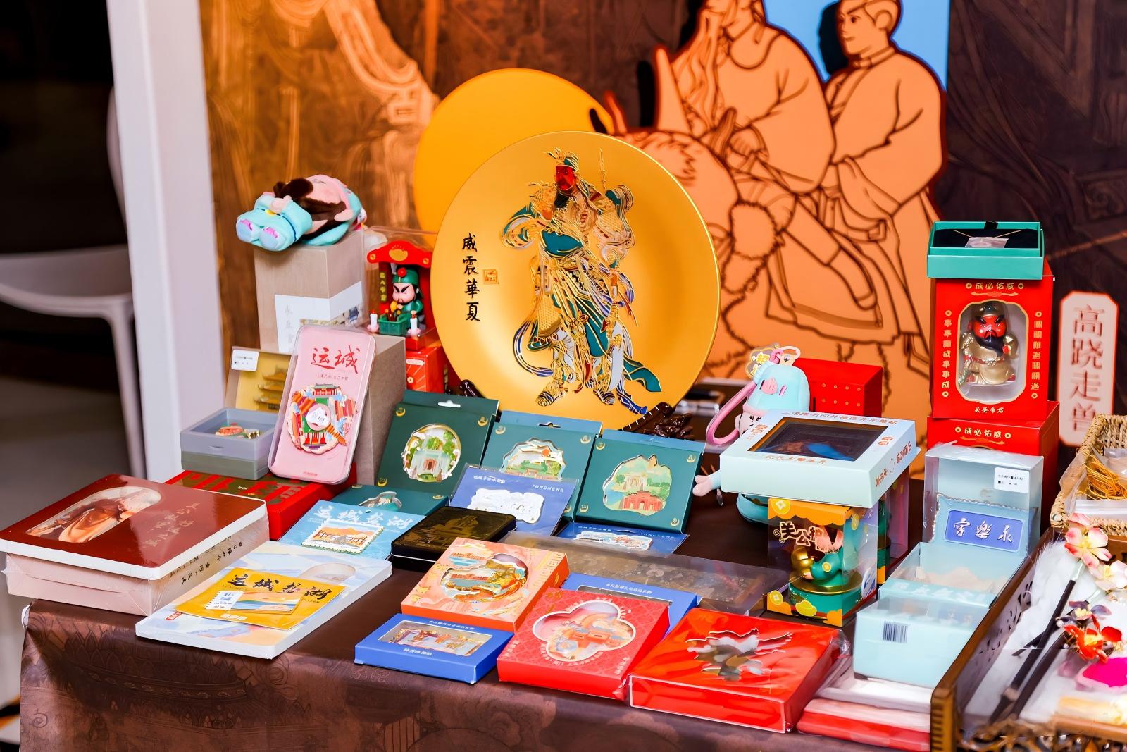 文旅展区内外联动、亮点纷呈:外场集中展示永乐宫、关帝庙、盐湖、鹳雀楼、五老峰等运城标志性文旅资源;场内打造沉浸式体验区,设置壁画艺术展、非遗文创展、互动答题等板块,高清呈现《朝元图》壁画精品,掐丝珐琅、剪纸等非遗技艺与潮趣文创相映成趣。关公、王之涣等经典IP人物化身NPC现身互动,引得观众争相打卡合影,近距离感受河东文化的独特韵味。