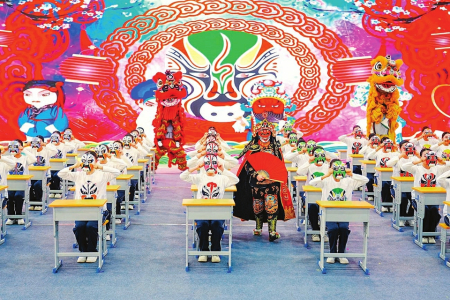 介休市汾秀中学以戏曲脸谱为主题进行表演,推进校园美育浸润行动实施。