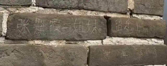 视频最后附带的图片显示,墙砖上被刻下“张丽霞、张蕊霞二姐妹留念”字样。