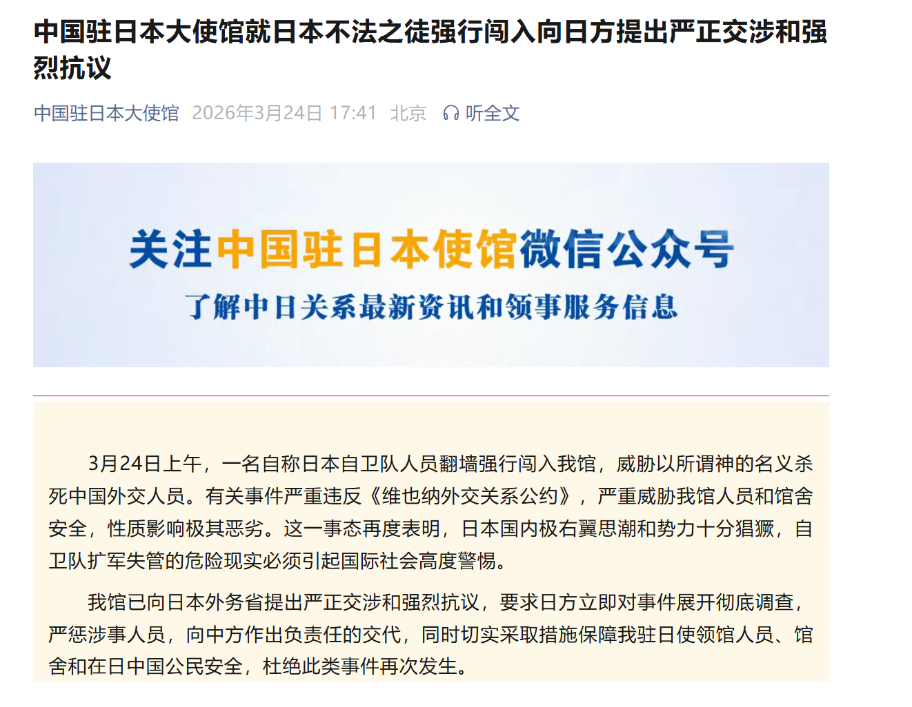 据中国驻日本大使馆官微消息,3月24日上午,一名自称日本自卫队人员翻墙强行闯入我馆,威胁以所谓神的名义杀死中国外交人员。有关事件严重违反《维也纳外交关系公约》,严重威胁我馆人员和馆舍安全,性质影响极其恶劣。这一事态再度表明,日本国内极右翼思潮和势力十分猖獗,自卫队扩军失管的危险现实必须引起国际社会高度警惕。