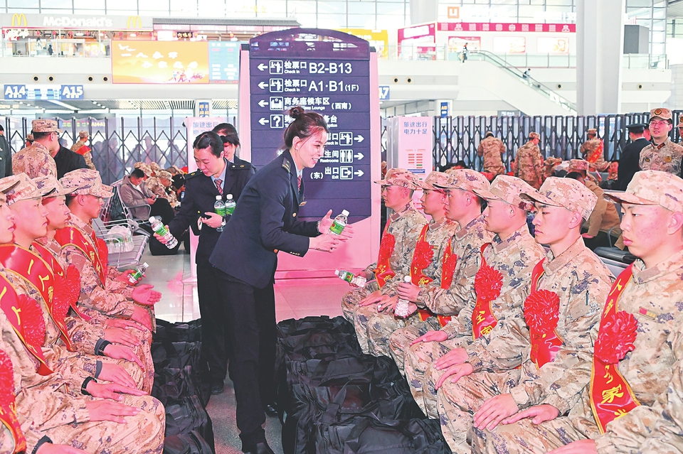 为保障新兵出行顺畅,国铁太原局管内太原南、大同南、临汾西等车站提前与当地征兵部门建立信息互通机制,精准掌握新兵的乘车车次、人员数量和流向需求,按照“一站一案”原则细化运输组织方案,落实“军人依法优先”政策。同时,开辟新兵专用绿色通道,设置专用候车区和集结点,实现“专人办票、专人安检、专人引导、专区候车”全流程服务。