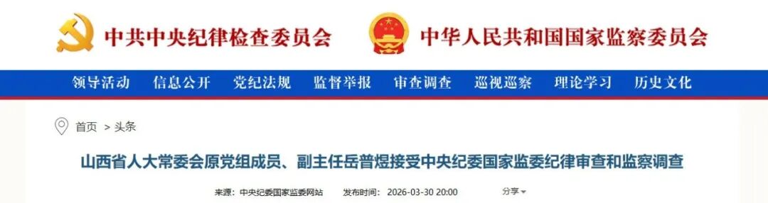 山西省人大常委会原党组成员、副主任岳普煜涉嫌严重违纪违法,目前正接受中央纪委国家监委纪律审查和监察调查。