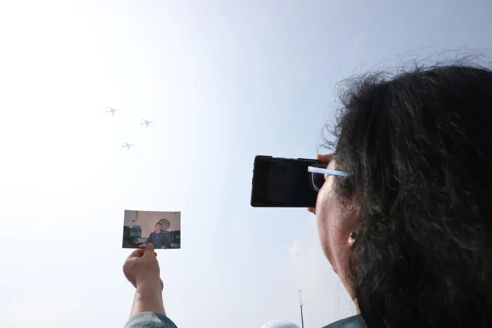 9月3日,空中梯队飞过天安门广场时,王伟的妻子阮国琴在观礼台上把王伟的照片举向蓝天。新华社记者 殷刚 摄