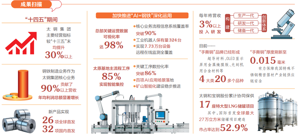 融入宝武为太钢打开全新发展空间,我们快速构建“一总部五基地”布局,实现由内陆走向沿海,同时聚焦不锈钢主业轻装上阵,全面对接宝武先进管理体系,经营质效大幅提升。作为山西省特钢材料产业链“链主”企业,太钢立足资源禀赋与产业优势,坚持高端化、智能化、绿色化、高效化方向,加快原创技术攻关与成果转化,手撕钢、芯片钢、超高强磁轭钢等高端产品打破国外垄断,有力支撑先进制造业发展。“十四五”期间,新产品实现26项全球首发、32项国内首发。