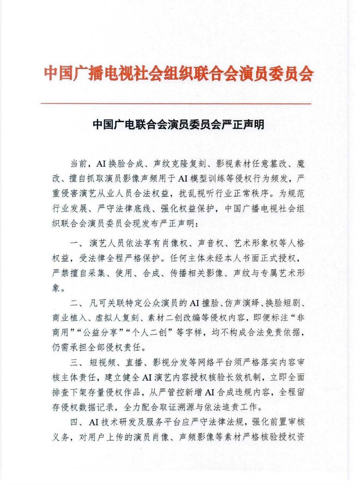 当前,AI换脸合成、声纹克隆复刻、影视素材任意篡改、魔改、擅自抓取演员影像声频用于AI模型训练等侵权行为频发,严重侵害演艺从业人员合法权益,扰乱视听行业正常秩序。为规范行业发展、严守法律底线、强化权益保护,中国广播电视社会组织联合会演员委员会现发布严正声明。