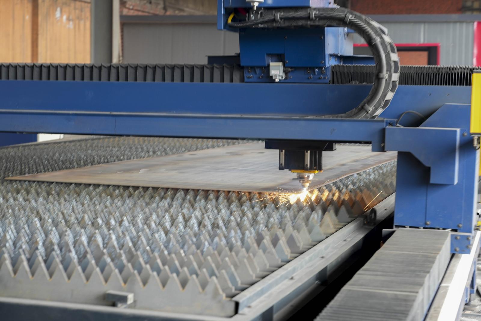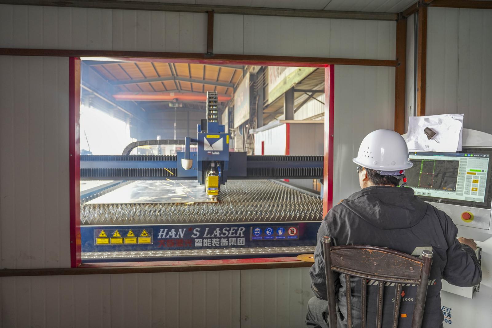 文水县钢结构钢模板专业镇鑫邦机械制造有限公司生产车间激光切割设备正在工作。