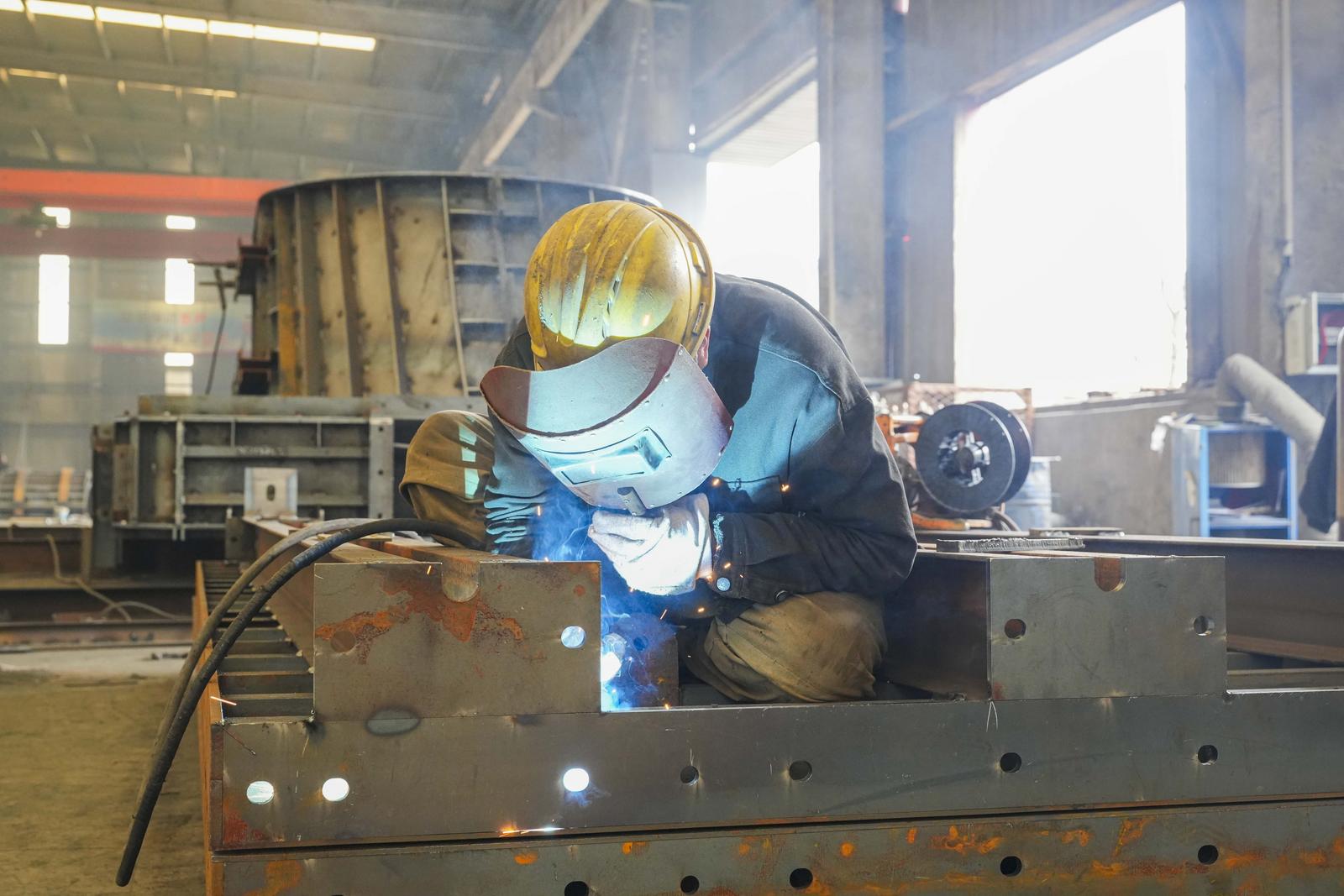 工人对钢模板进行焊接。