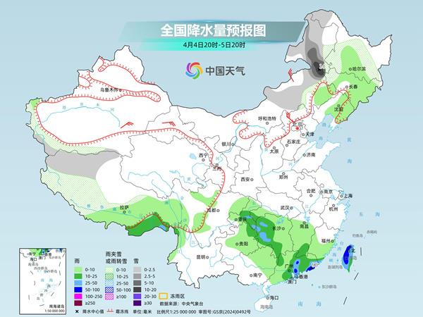 4月5日夜间到后天,重庆中部、贵州东部、四川中部、湖南南部、江西中南部、浙江南部、广西北部、广东北部、福建大部、西藏东南部等地部分地区有中到大雨,其中,湖南东南部、江西南部、福建中部、广东北部等地部分地区有暴雨到大暴雨。