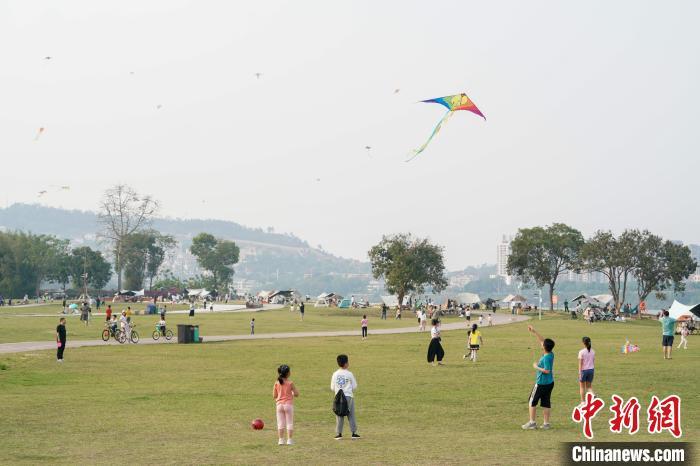 资料图:正值清明节假期,广西南宁不少民众外出踏青游玩,享受假日。图为儿童在南宁市龟山滨江公园放风筝。 陈冠言 摄