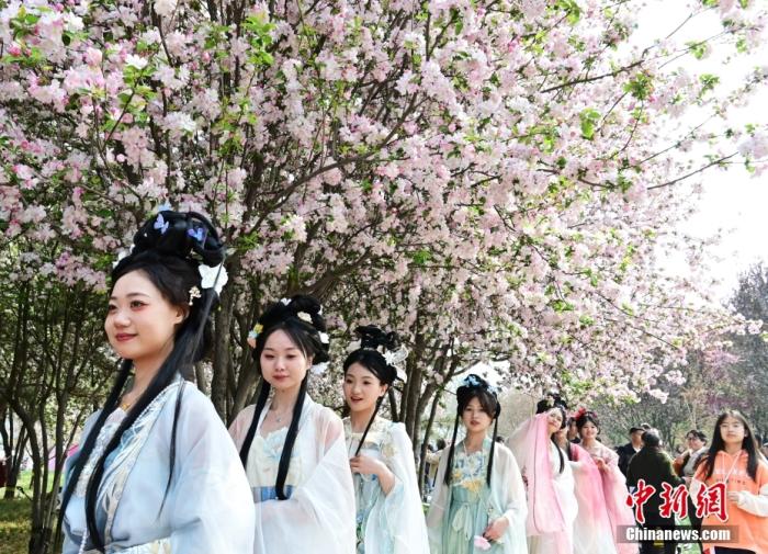 资料图:河北省石家庄市栾城区一公园,身着古装服饰的游客踏青游玩,享受美好春光。中新社记者 翟羽佳 摄